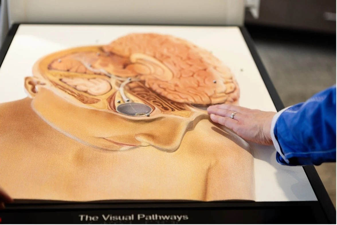 The New England College of Optometry (NECO) Center for Eye Care has a new interactive experience featuring a tactile image of the visual system on display at 930 Commonwealth Ave. A tactile image allows touch and sound to stimulate a sensory experience for the brain to create a visual image that allows a person to ‘see’. The visual system is complex, but this learning tool helps individuals understand the inner-workings of the brain that create a visual understanding of the world.