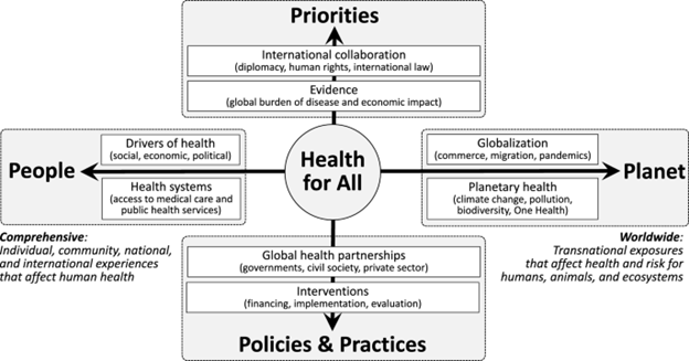 Second, the Koplan definition of global health, which predates the integrated cross-sectoral vision of the SDGs, focuses exclusively on human health. Since that definition was published, climate change, biodiversity loss, persistent pollution, and other forms of environmental degradation have come to be recognized as leading threats to the health and wellbeing of current and future generations [15]. Humans are interdependent with animals and ecosystems, as emphasized in the One Health approach, and all living things depend on a healthy Earth and healthy ecosystems for survival [16]. Because environmental sustainability is now recognized as essential to safeguarding human security, an updated definition of global health must make planetary health a visible priority [17, 18].