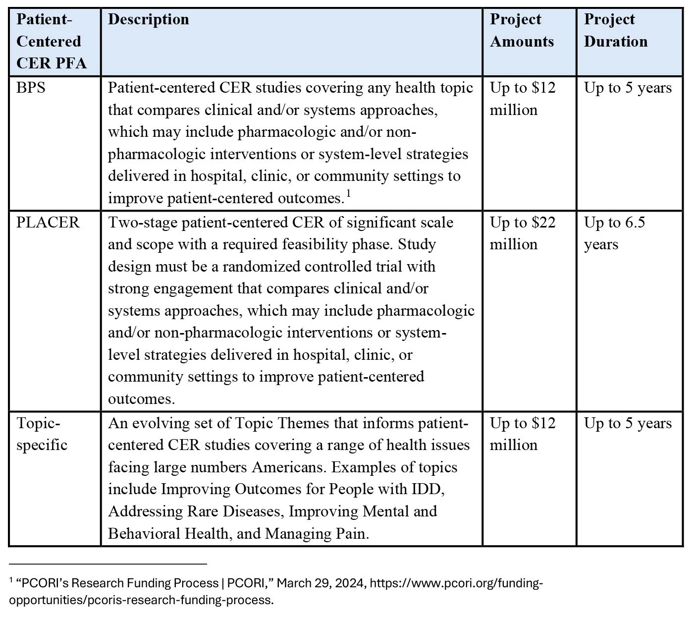 PCORI Funding Announcements (PFAs) for patient-centered CER are offered several times per year. There are several types of PFAs, notably the Broad Pragmatic Studies (BPS), Phased Large Awards for Comparative Effectiveness Research (PLACER), and varying topic-specific PFAs. These funding opportunities are explained in Table 3 below: