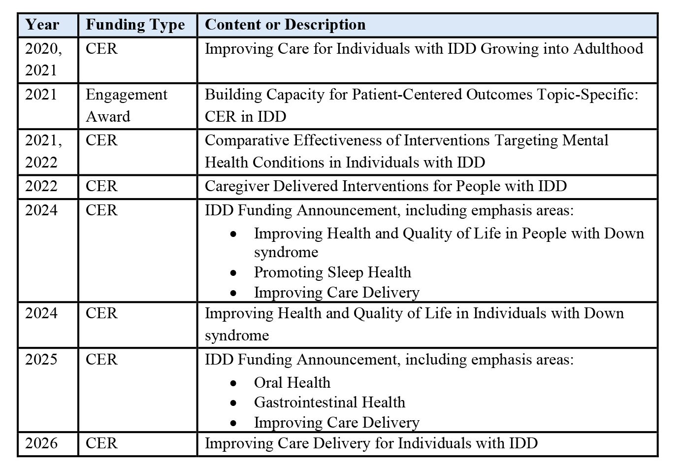 PCORI prioritizes funding research to improve the health of people with IDD. To date, PCORI has issued several funding opportunities specific to the IDD population, summarized in Table 5 below: