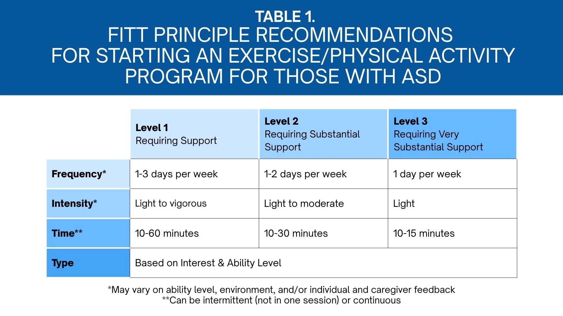 The Table outlines the intensity recommendations among those with autism based on their severity level. All autistic individuals should initially begin exercise at a light intensity but should progress at higher intensities based on their severity level (level 1: light to vigorous, level 2: light to moderate, level 3: light) when responses to exercise are appropriate.