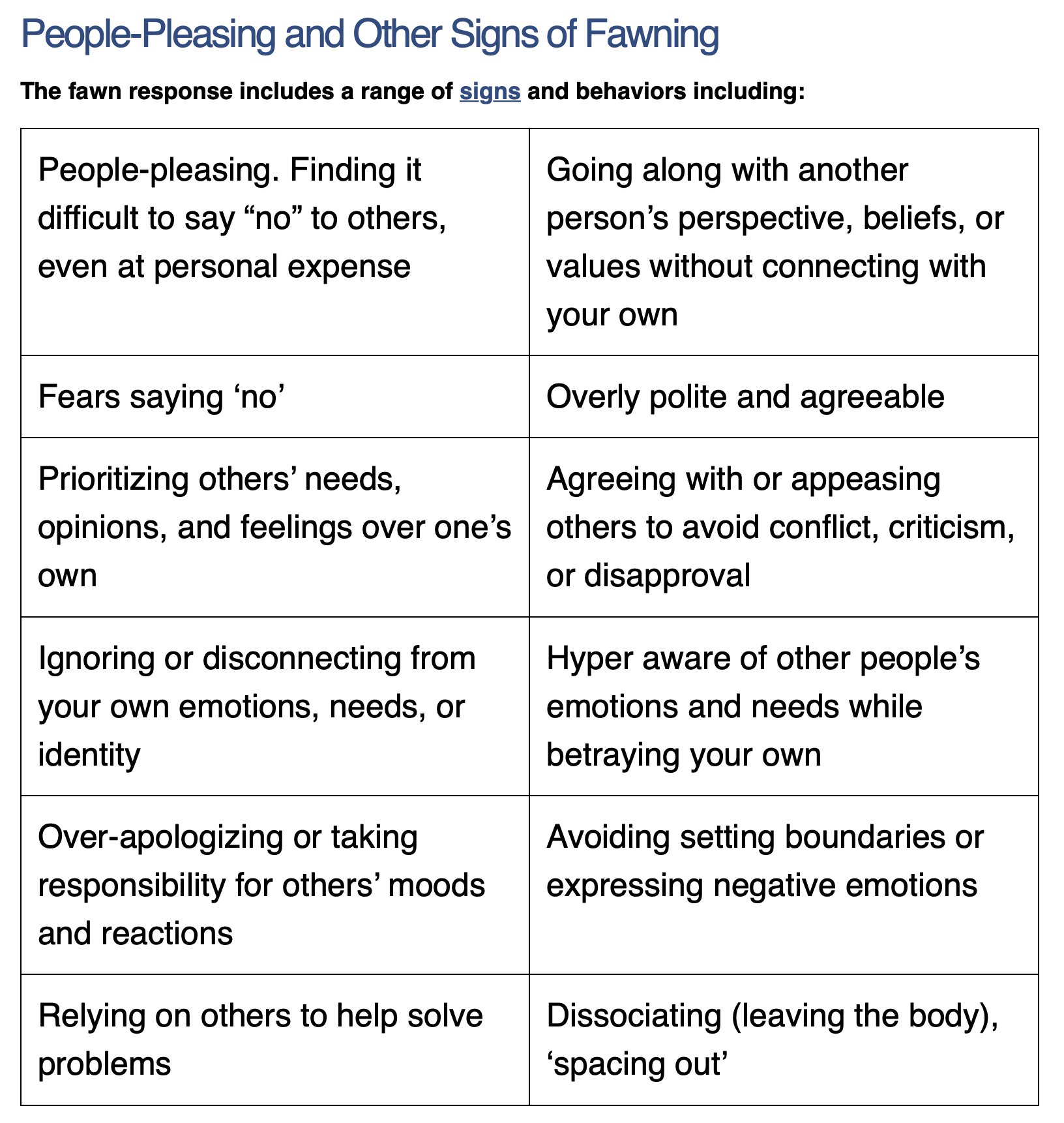 Most people have heard of the “fight” or “flight” responses to a threat, and possibly the “freeze” response. “Fawning”, however, is a lesser known defense, completing what are referred to as the “Four Fs” of trauma response. (A fifth, “flop” is also increasingly included).