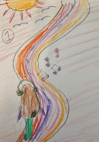 Section 1: This is a depiction of “the happy place” they see when they close their eyes. Featuring a rainbow road to walk down and their favorite music playing through their headphones.