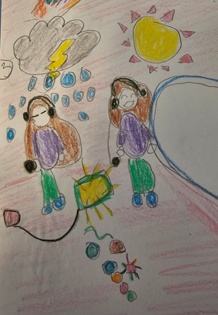 Section 3: This is a depiction of their struggles with depression. A rain cloud shows the sadness they experience when they feel alone. However, through the use of lightboxes, fidget toys, and especially music they are able to find sunshine again.